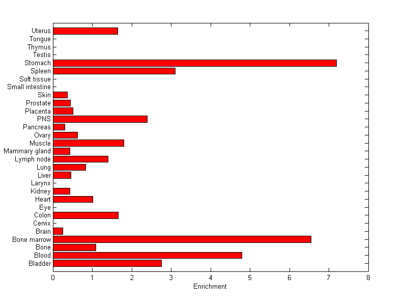 The expression level is normalized with tissue-library size. Each value for a gene in a tissue is a ratio of observed ESTs to the expected one in this tissue. The expected number of ESTs is the product of total ESTs of the gene and the fraction of total ESTs in the tissue among all ESTs in 30 tissues.
