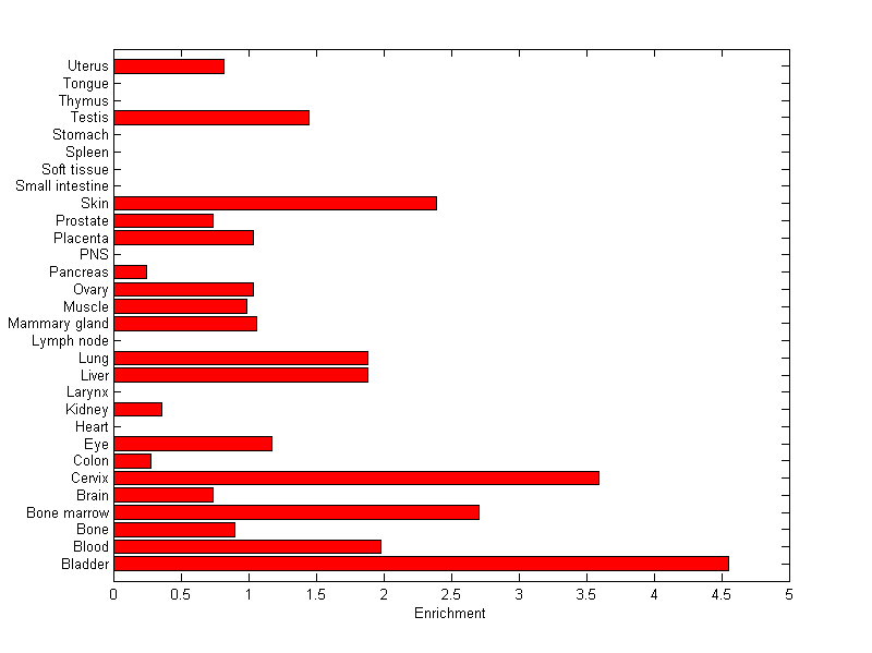 The expression level is normalized with tissue-library size. Each value for a gene in a tissue is a ratio of observed ESTs to the expected one in this tissue. The expected number of ESTs is the product of total ESTs of the gene and the fraction of total ESTs in the tissue among all ESTs in 30 tissues.
