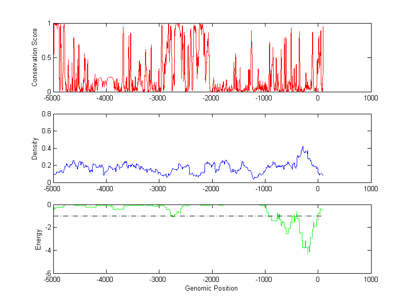 The energy profile (green curve) is about energy for module detection based on TF interaction. The positions with energy less than -1 indicate the existence of CRMs.