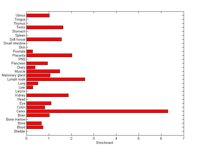 The expression level is normalized with tissue-library size. Each value for a gene in a tissue is a ratio of observed ESTs to the expected one in this tissue. The expected number of ESTs is the product of total ESTs of the gene and the fraction of total ESTs in the tissue among all ESTs in 30 tissues.