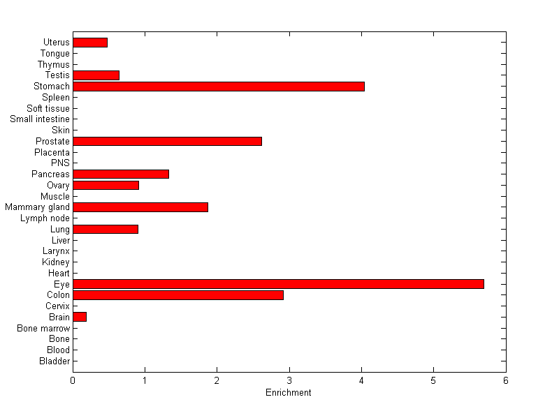 The expression level is normalized with tissue-library size. Each value for a gene in a tissue is a ratio of observed ESTs to the expected one in this tissue. The expected number of ESTs is the product of total ESTs of the gene and the fraction of total ESTs in the tissue among all ESTs in 30 tissues.