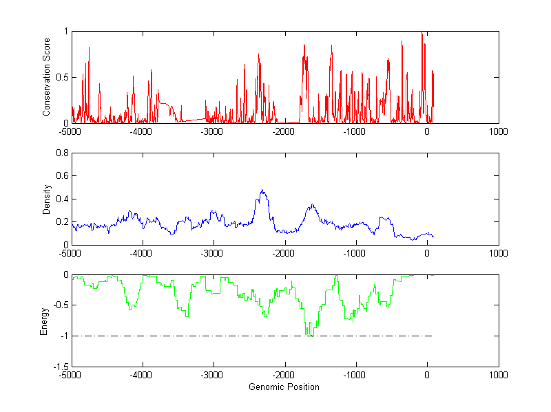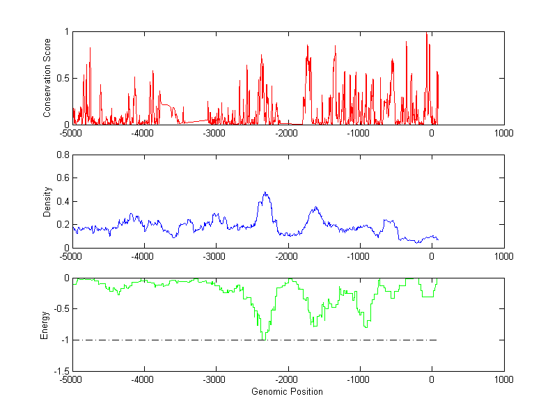 About the profiles: The conservation profile (red curve) is about conservation scores of the promoter sequences. Conservation was determined from an eight-way alignment of human, chimpanzee, dog, mouse, rat, chicken, zebrafish and fugu sequences. The conservation was quantified by a conservation score between 0 and 1, with 1 as highest conservation. The conservation score was obtained from UCSC genome databases. The density profile (blue curve) is about density of all TF binding sites. The energy profile (green curve) is about energy for module detection based on TF interaction. The positions with energy less than -1 indicate the existence of CRMs. Download: Conservation profileDensity profile Energy profile CRM summary |