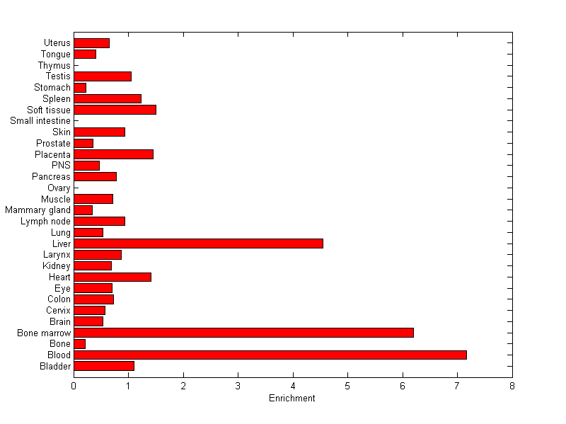 About the profile: The expression level is normalized with tissue-library size. Each value for a gene in a tissue is a ratio of observed ESTs to the expected one in this tissue. The expected number of ESTs is the product of total ESTs of the gene and the fraction of total ESTs in the tissue among all ESTs in 30 tissues. Summary: This gene is preferentially expressed in [blood, bone_marrow] Download: |