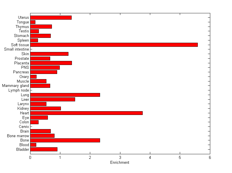 The expression level is normalized with tissue-library size. Each value for a gene in a tissue is a ratio of observed ESTs to the expected one in this tissue. The expected number of ESTs is the product of total ESTs of the gene and the fraction of total ESTs in the tissue among all ESTs in 30 tissues.