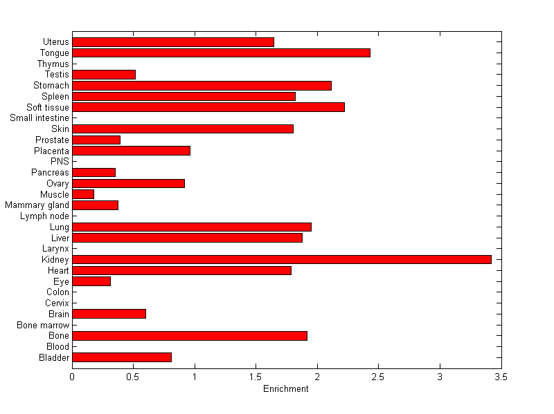 The expression level is normalized with tissue-library size. Each value for a gene in a tissue is a ratio of observed ESTs to the expected one in this tissue. The expected number of ESTs is the product of total ESTs of the gene and the fraction of total ESTs in the tissue among all ESTs in 30 tissues.