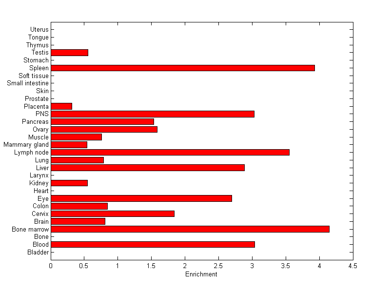 The expression level is normalized with tissue-library size. Each value for a gene in a tissue is a ratio of observed ESTs to the expected one in this tissue. The expected number of ESTs is the product of total ESTs of the gene and the fraction of total ESTs in the tissue among all ESTs in 30 tissues.
