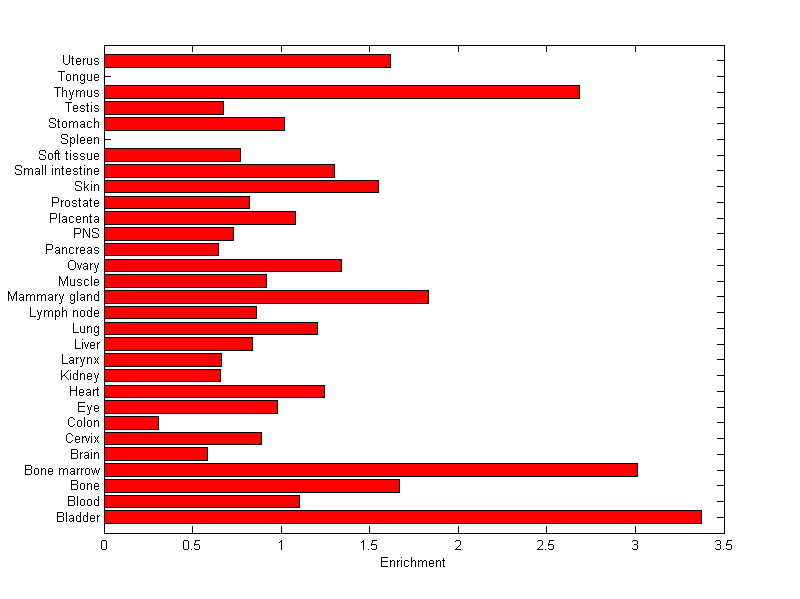 The expression level is normalized with tissue-library size. Each value for a gene in a tissue is a ratio of observed ESTs to the expected one in this tissue. The expected number of ESTs is the product of total ESTs of the gene and the fraction of total ESTs in the tissue among all ESTs in 30 tissues.