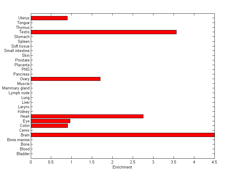 The expression level is normalized with tissue-library size. Each value for a gene in a tissue is a ratio of observed ESTs to the expected one in this tissue. The expected number of ESTs is the product of total ESTs of the gene and the fraction of total ESTs in the tissue among all ESTs in 30 tissues.