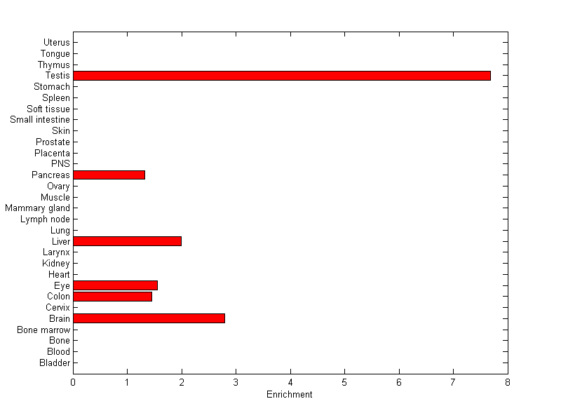 The expression level is normalized with tissue-library size. Each value for a gene in a tissue is a ratio of observed ESTs to the expected one in this tissue. The expected number of ESTs is the product of total ESTs of the gene and the fraction of total ESTs in the tissue among all ESTs in 30 tissues.