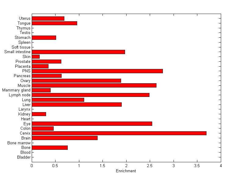 The expression level is normalized with tissue-library size. Each value for a gene in a tissue is a ratio of observed ESTs to the expected one in this tissue. The expected number of ESTs is the product of total ESTs of the gene and the fraction of total ESTs in the tissue among all ESTs in 30 tissues.