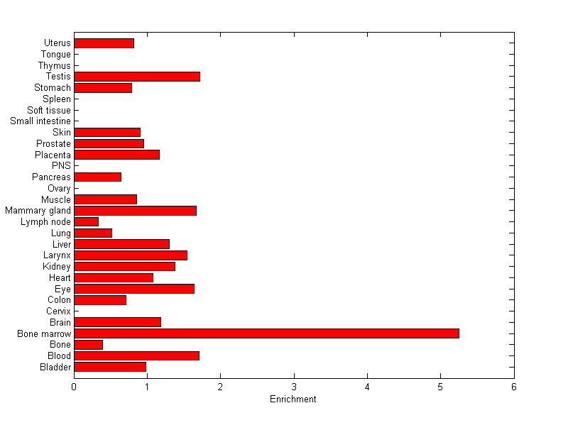 The expression level is normalized with tissue-library size. Each value for a gene in a tissue is a ratio of observed ESTs to the expected one in this tissue. The expected number of ESTs is the product of total ESTs of the gene and the fraction of total ESTs in the tissue among all ESTs in 30 tissues.
