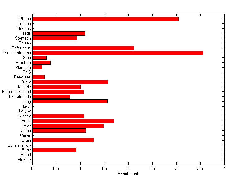The expression level is normalized with tissue-library size. Each value for a gene in a tissue is a ratio of observed ESTs to the expected one in this tissue. The expected number of ESTs is the product of total ESTs of the gene and the fraction of total ESTs in the tissue among all ESTs in 30 tissues.