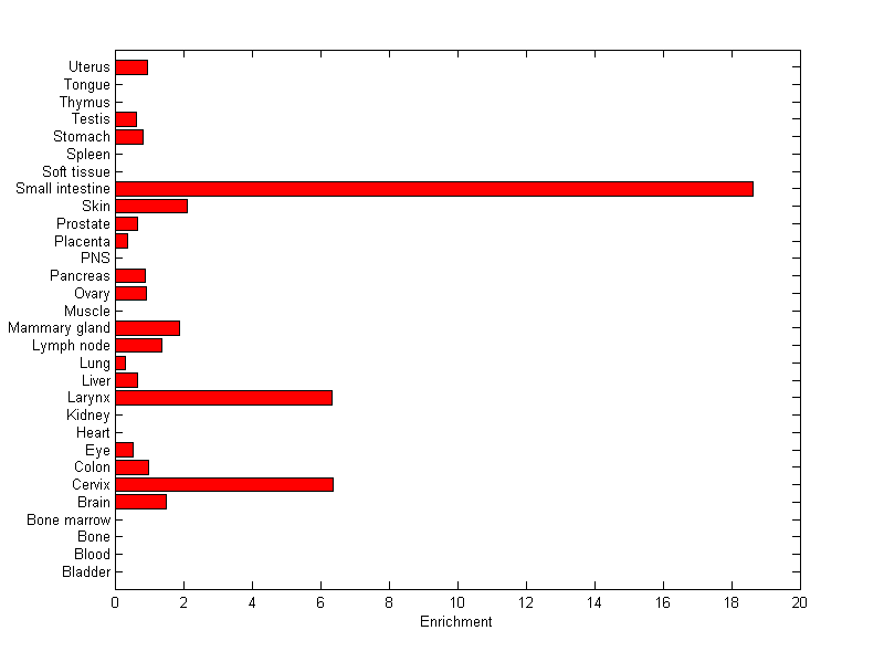 The expression level is normalized with tissue-library size. Each value for a gene in a tissue is a ratio of observed ESTs to the expected one in this tissue. The expected number of ESTs is the product of total ESTs of the gene and the fraction of total ESTs in the tissue among all ESTs in 30 tissues.