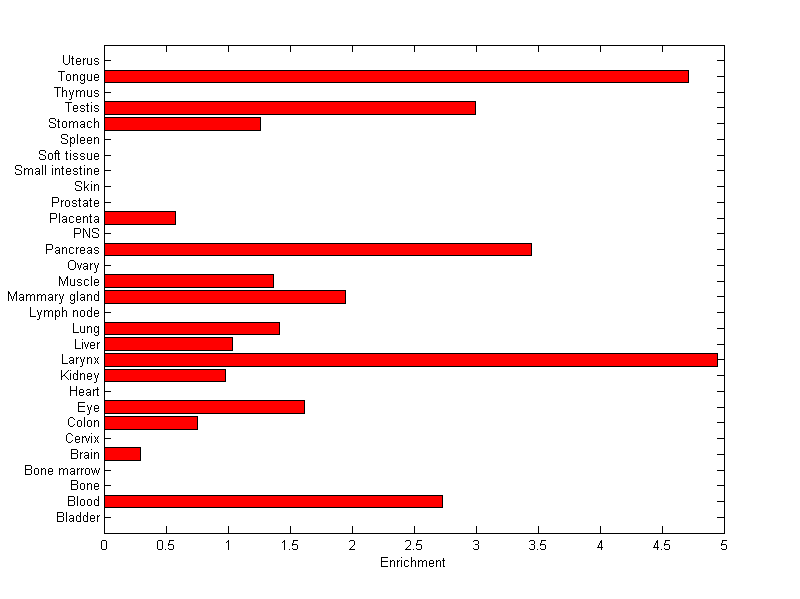 The expression level is normalized with tissue-library size. Each value for a gene in a tissue is a ratio of observed ESTs to the expected one in this tissue. The expected number of ESTs is the product of total ESTs of the gene and the fraction of total ESTs in the tissue among all ESTs in 30 tissues.