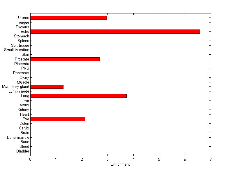 The expression level is normalized with tissue-library size. Each value for a gene in a tissue is a ratio of observed ESTs to the expected one in this tissue. The expected number of ESTs is the product of total ESTs of the gene and the fraction of total ESTs in the tissue among all ESTs in 30 tissues.