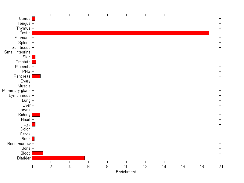 The expression level is normalized with tissue-library size. Each value for a gene in a tissue is a ratio of observed ESTs to the expected one in this tissue. The expected number of ESTs is the product of total ESTs of the gene and the fraction of total ESTs in the tissue among all ESTs in 30 tissues.
