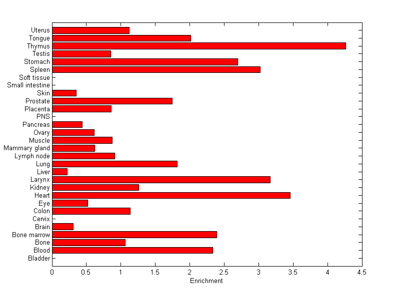 The expression level is normalized with tissue-library size. Each value for a gene in a tissue is a ratio of observed ESTs to the expected one in this tissue. The expected number of ESTs is the product of total ESTs of the gene and the fraction of total ESTs in the tissue among all ESTs in 30 tissues.