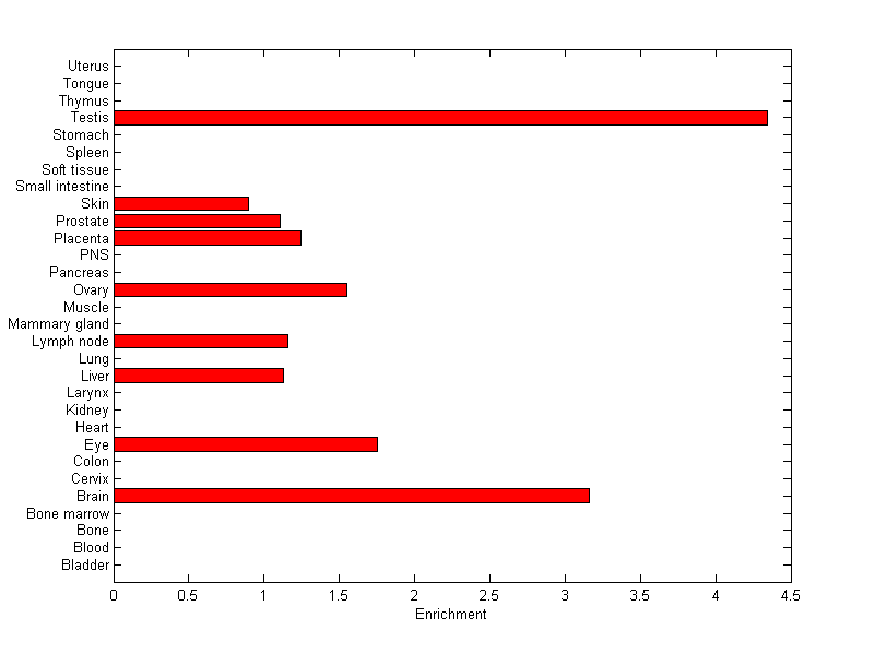 The expression level is normalized with tissue-library size. Each value for a gene in a tissue is a ratio of observed ESTs to the expected one in this tissue. The expected number of ESTs is the product of total ESTs of the gene and the fraction of total ESTs in the tissue among all ESTs in 30 tissues.