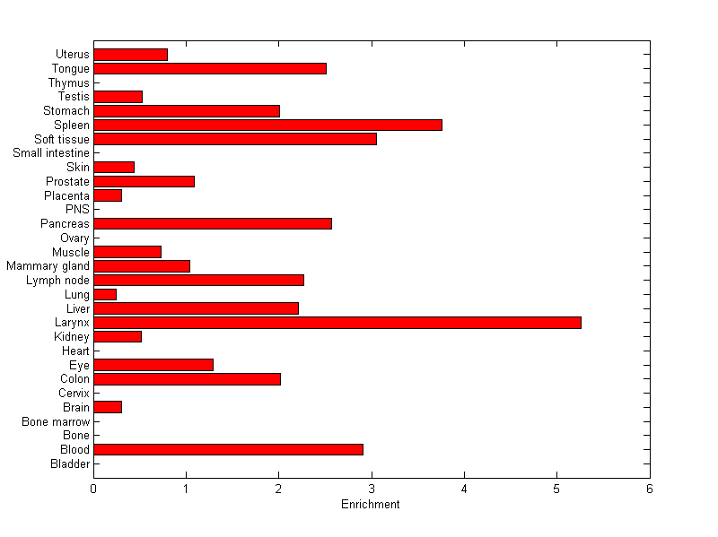 The expression level is normalized with tissue-library size. Each value for a gene in a tissue is a ratio of observed ESTs to the expected one in this tissue. The expected number of ESTs is the product of total ESTs of the gene and the fraction of total ESTs in the tissue among all ESTs in 30 tissues.