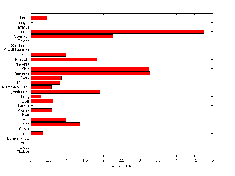 The expression level is normalized with tissue-library size. Each value for a gene in a tissue is a ratio of observed ESTs to the expected one in this tissue. The expected number of ESTs is the product of total ESTs of the gene and the fraction of total ESTs in the tissue among all ESTs in 30 tissues.