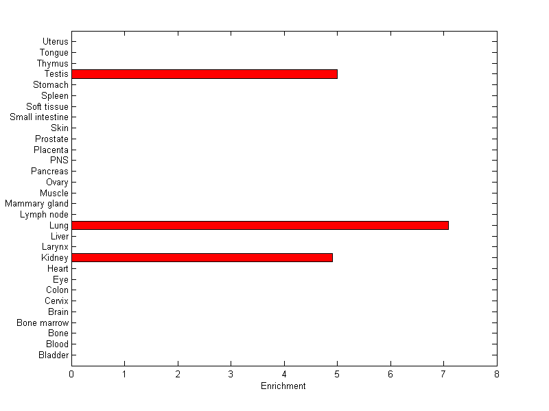 About the profile: The expression level is normalized with tissue-library size. Each value for a gene in a tissue is a ratio of observed ESTs to the expected one in this tissue. The expected number of ESTs is the product of total ESTs of the gene and the fraction of total ESTs in the tissue among all ESTs in 30 tissues. Summary: This gene is preferentially expressed in [lung] Download: |