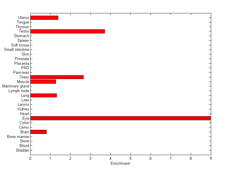 About the profile: The expression level is normalized with tissue-library size. Each value for a gene in a tissue is a ratio of observed ESTs to the expected one in this tissue. The expected number of ESTs is the product of total ESTs of the gene and the fraction of total ESTs in the tissue among all ESTs in 30 tissues. Summary: This gene is preferentially expressed in [eye] Download: |