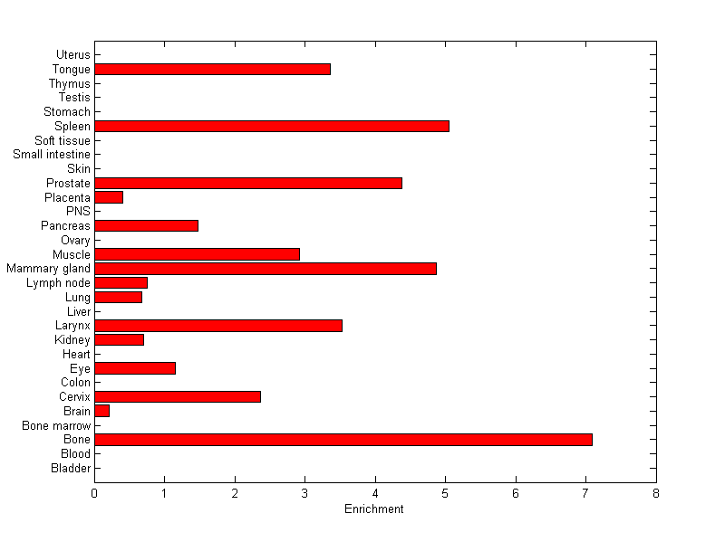 The expression level is normalized with tissue-library size. Each value for a gene in a tissue is a ratio of observed ESTs to the expected one in this tissue. The expected number of ESTs is the product of total ESTs of the gene and the fraction of total ESTs in the tissue among all ESTs in 30 tissues.