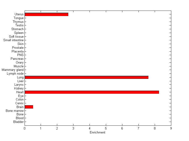 The expression level is normalized with tissue-library size. Each value for a gene in a tissue is a ratio of observed ESTs to the expected one in this tissue. The expected number of ESTs is the product of total ESTs of the gene and the fraction of total ESTs in the tissue among all ESTs in 30 tissues.
