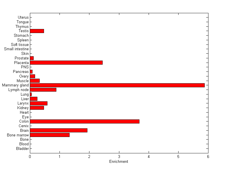 The expression level is normalized with tissue-library size. Each value for a gene in a tissue is a ratio of observed ESTs to the expected one in this tissue. The expected number of ESTs is the product of total ESTs of the gene and the fraction of total ESTs in the tissue among all ESTs in 30 tissues.