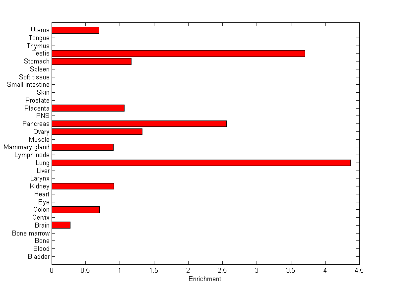 The expression level is normalized with tissue-library size. Each value for a gene in a tissue is a ratio of observed ESTs to the expected one in this tissue. The expected number of ESTs is the product of total ESTs of the gene and the fraction of total ESTs in the tissue among all ESTs in 30 tissues.