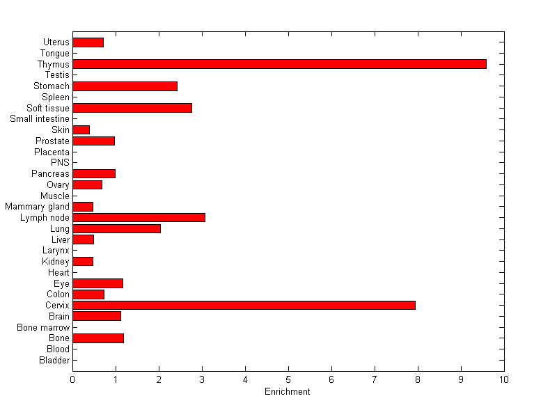 The expression level is normalized with tissue-library size. Each value for a gene in a tissue is a ratio of observed ESTs to the expected one in this tissue. The expected number of ESTs is the product of total ESTs of the gene and the fraction of total ESTs in the tissue among all ESTs in 30 tissues.