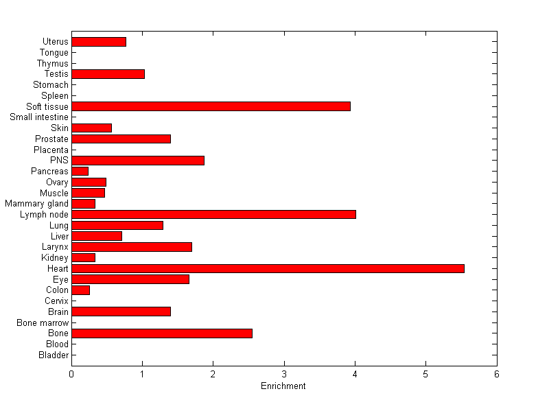 The expression level is normalized with tissue-library size. Each value for a gene in a tissue is a ratio of observed ESTs to the expected one in this tissue. The expected number of ESTs is the product of total ESTs of the gene and the fraction of total ESTs in the tissue among all ESTs in 30 tissues.