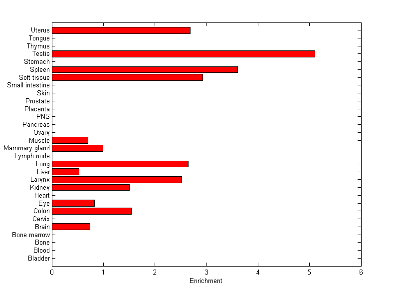 The expression level is normalized with tissue-library size. Each value for a gene in a tissue is a ratio of observed ESTs to the expected one in this tissue. The expected number of ESTs is the product of total ESTs of the gene and the fraction of total ESTs in the tissue among all ESTs in 30 tissues.