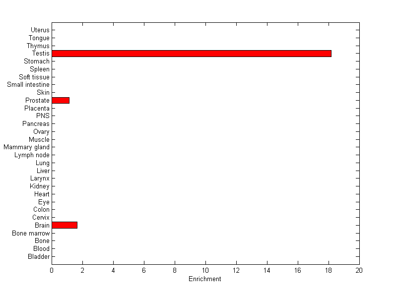 The expression level is normalized with tissue-library size. Each value for a gene in a tissue is a ratio of observed ESTs to the expected one in this tissue. The expected number of ESTs is the product of total ESTs of the gene and the fraction of total ESTs in the tissue among all ESTs in 30 tissues.