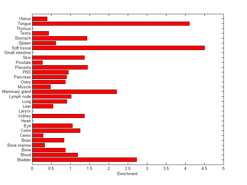 The expression level is normalized with tissue-library size. Each value for a gene in a tissue is a ratio of observed ESTs to the expected one in this tissue. The expected number of ESTs is the product of total ESTs of the gene and the fraction of total ESTs in the tissue among all ESTs in 30 tissues.