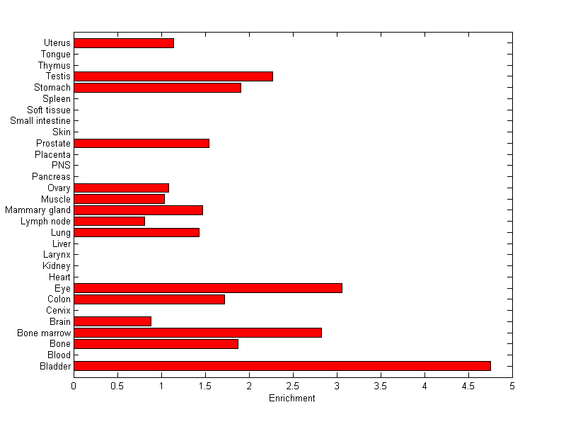 The expression level is normalized with tissue-library size. Each value for a gene in a tissue is a ratio of observed ESTs to the expected one in this tissue. The expected number of ESTs is the product of total ESTs of the gene and the fraction of total ESTs in the tissue among all ESTs in 30 tissues.