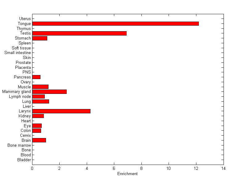 The expression level is normalized with tissue-library size. Each value for a gene in a tissue is a ratio of observed ESTs to the expected one in this tissue. The expected number of ESTs is the product of total ESTs of the gene and the fraction of total ESTs in the tissue among all ESTs in 30 tissues.