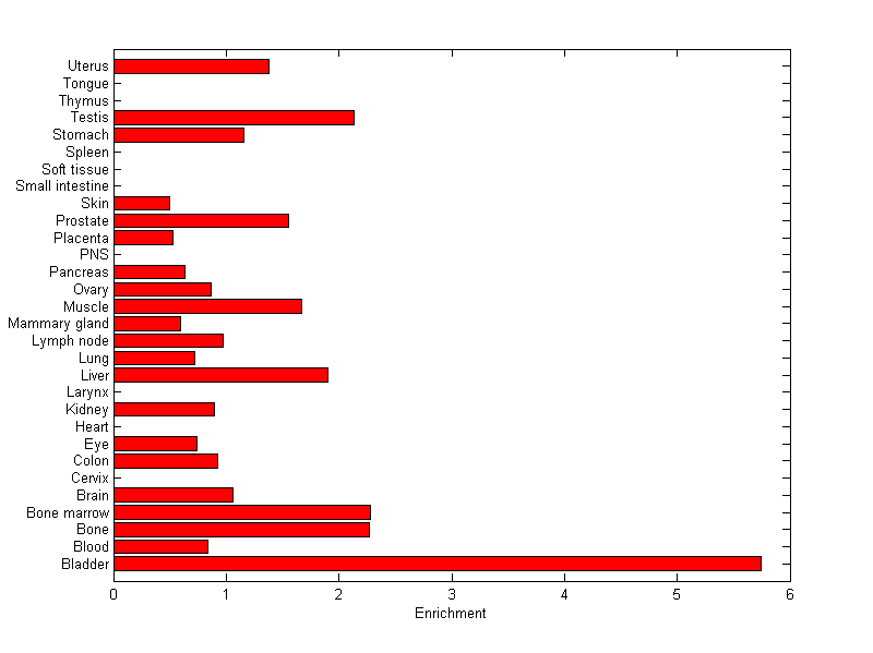 The expression level is normalized with tissue-library size. Each value for a gene in a tissue is a ratio of observed ESTs to the expected one in this tissue. The expected number of ESTs is the product of total ESTs of the gene and the fraction of total ESTs in the tissue among all ESTs in 30 tissues.
