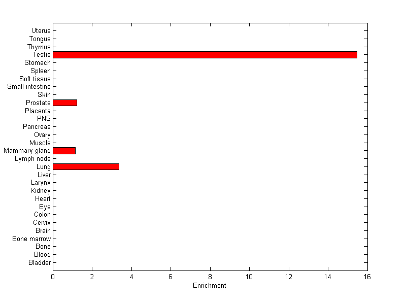 The expression level is normalized with tissue-library size. Each value for a gene in a tissue is a ratio of observed ESTs to the expected one in this tissue. The expected number of ESTs is the product of total ESTs of the gene and the fraction of total ESTs in the tissue among all ESTs in 30 tissues.