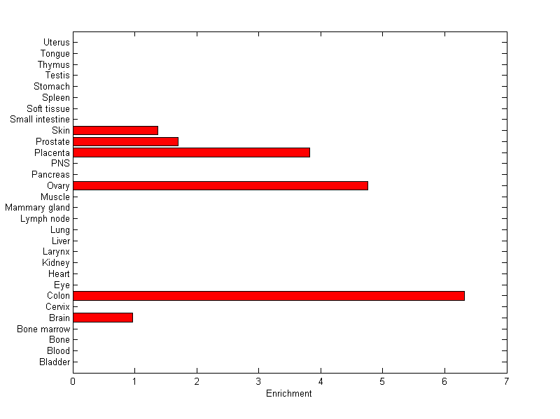 The expression level is normalized with tissue-library size. Each value for a gene in a tissue is a ratio of observed ESTs to the expected one in this tissue. The expected number of ESTs is the product of total ESTs of the gene and the fraction of total ESTs in the tissue among all ESTs in 30 tissues.