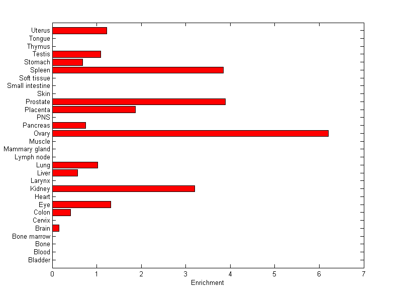 The expression level is normalized with tissue-library size. Each value for a gene in a tissue is a ratio of observed ESTs to the expected one in this tissue. The expected number of ESTs is the product of total ESTs of the gene and the fraction of total ESTs in the tissue among all ESTs in 30 tissues.