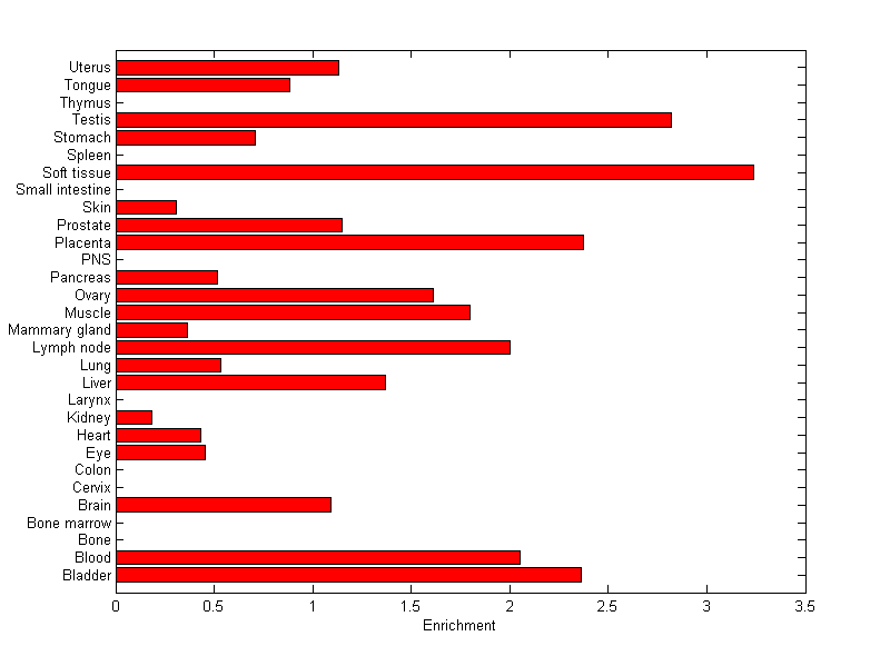 The expression level is normalized with tissue-library size. Each value for a gene in a tissue is a ratio of observed ESTs to the expected one in this tissue. The expected number of ESTs is the product of total ESTs of the gene and the fraction of total ESTs in the tissue among all ESTs in 30 tissues.