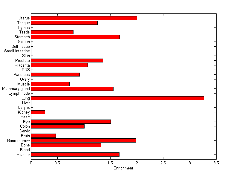 The expression level is normalized with tissue-library size. Each value for a gene in a tissue is a ratio of observed ESTs to the expected one in this tissue. The expected number of ESTs is the product of total ESTs of the gene and the fraction of total ESTs in the tissue among all ESTs in 30 tissues.