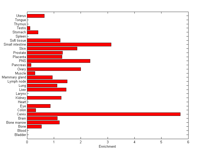 The expression level is normalized with tissue-library size. Each value for a gene in a tissue is a ratio of observed ESTs to the expected one in this tissue. The expected number of ESTs is the product of total ESTs of the gene and the fraction of total ESTs in the tissue among all ESTs in 30 tissues.