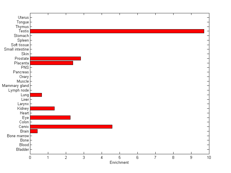 The expression level is normalized with tissue-library size. Each value for a gene in a tissue is a ratio of observed ESTs to the expected one in this tissue. The expected number of ESTs is the product of total ESTs of the gene and the fraction of total ESTs in the tissue among all ESTs in 30 tissues.