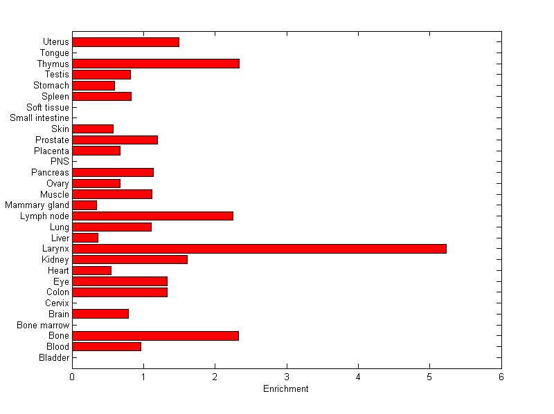 The expression level is normalized with tissue-library size. Each value for a gene in a tissue is a ratio of observed ESTs to the expected one in this tissue. The expected number of ESTs is the product of total ESTs of the gene and the fraction of total ESTs in the tissue among all ESTs in 30 tissues.
