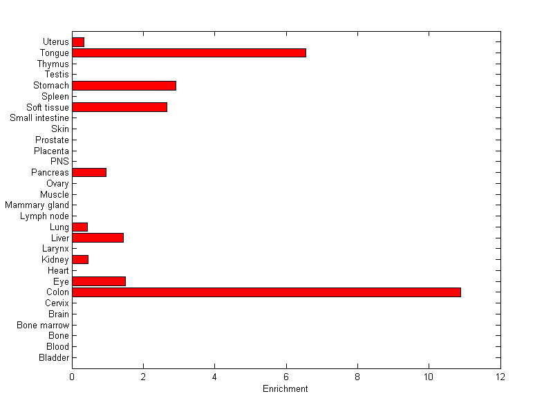 The expression level is normalized with tissue-library size. Each value for a gene in a tissue is a ratio of observed ESTs to the expected one in this tissue. The expected number of ESTs is the product of total ESTs of the gene and the fraction of total ESTs in the tissue among all ESTs in 30 tissues.