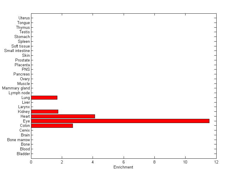 The expression level is normalized with tissue-library size. Each value for a gene in a tissue is a ratio of observed ESTs to the expected one in this tissue. The expected number of ESTs is the product of total ESTs of the gene and the fraction of total ESTs in the tissue among all ESTs in 30 tissues.