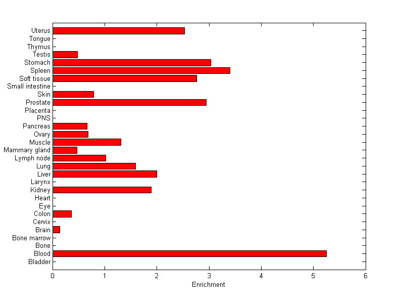 The expression level is normalized with tissue-library size. Each value for a gene in a tissue is a ratio of observed ESTs to the expected one in this tissue. The expected number of ESTs is the product of total ESTs of the gene and the fraction of total ESTs in the tissue among all ESTs in 30 tissues.