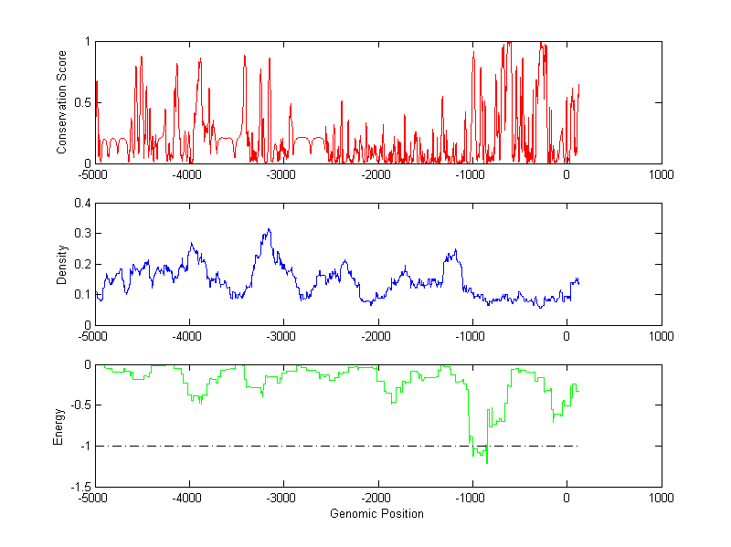 About the profiles: The conservation profile (red curve) is about conservation scores of the promoter sequences. Conservation was determined from an eight-way alignment of human, chimpanzee, dog, mouse, rat, chicken, zebrafish and fugu sequences. The conservation was quantified by a conservation score between 0 and 1, with 1 as highest conservation. The conservation score was obtained from UCSC genome databases. The density profile (blue curve) is about density of all TF binding sites. The energy profile (green curve) is about energy for module detection based on TF interaction. The positions with energy less than -1 indicate the existence of CRMs. Download: Conservation profileDensity profile Energy profile CRM summary |